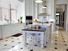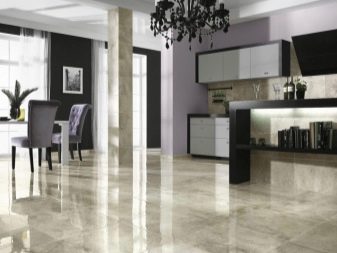 أما بالنسبة للاتجاهات الأسلوبية الأكثر حداثة ، إذن لأسلوب التكنولوجيا الفائقة أو بساطتها أرضية قرميدية خفيفة لامعة مثالية. من الأفضل أن يكون موديل من نغمة واحدة ، ويفضل أن يكون أسود ، أو رمادي ، أو أبيض ، أو بيج. يمكنك التقاط نماذج بنمط ثلاثي الأبعاد.