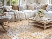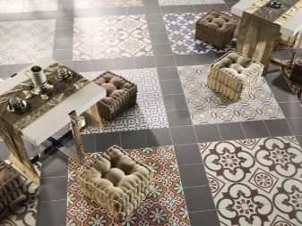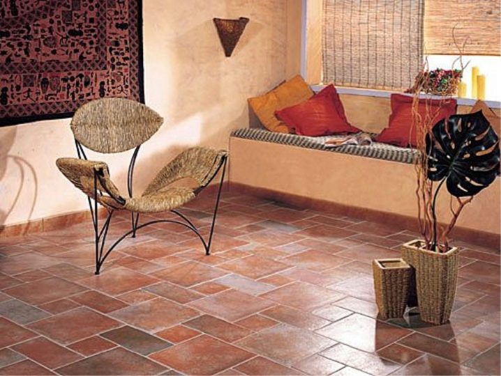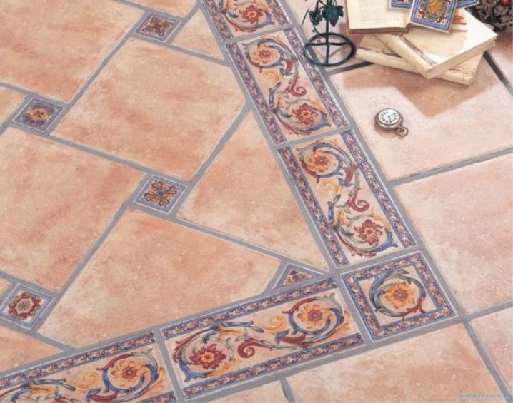 في المناطق الداخلية ذات الطراز الريفي ، يمكنك وضع البلاط تحت شجرة ، وفي وسط الغرفة يمكنك إنشاء منطقة مميزة بنقوش غير عادية تشبه السجادة. هذا الحل يبدو أنيقًا وغير عادي..