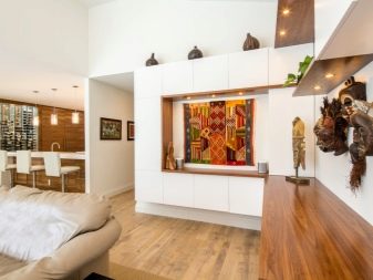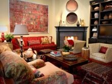 زخرفة الشقة في النمط الهندي مناسبة لأولئك الذين لا يحبون المعايير والصور النمطية. يتميز هذا النمط بوفرة من الوسائد سواء على الأريكة أو على الأرض ، والسجاد على الحائط بألوان متنوعة..