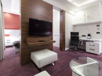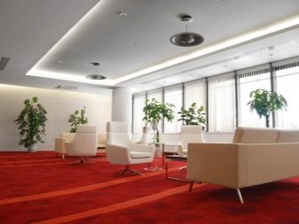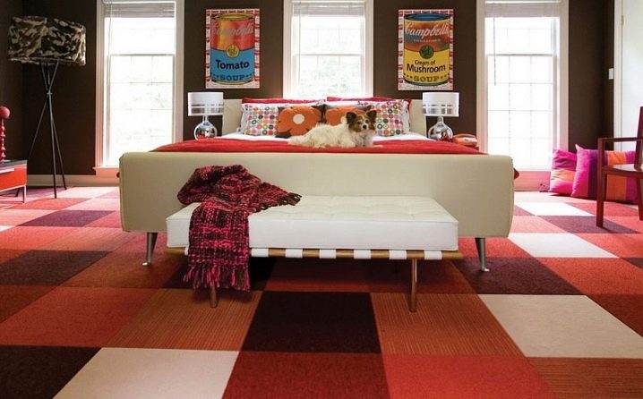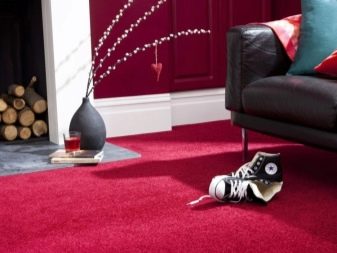 لا يتسامح اللون الأحمر المشرق والنشط والحيوي للسجادة مع وجود أجسام كبيرة من نفس اللون في الداخل. لخلق جو من الطاقة الإيجابية والرقي والأناقة ، لإبراز الداخل ، على النقيض من الأرضيات الحمراء ، يجب أن تكون الجدران بيضاء أو بألوان فاتحة أخرى. هذا ليس الخيار الأفضل لغرف النوم ، الحل المثالي هو القاعة ، الباب الأمامي ، الممر.