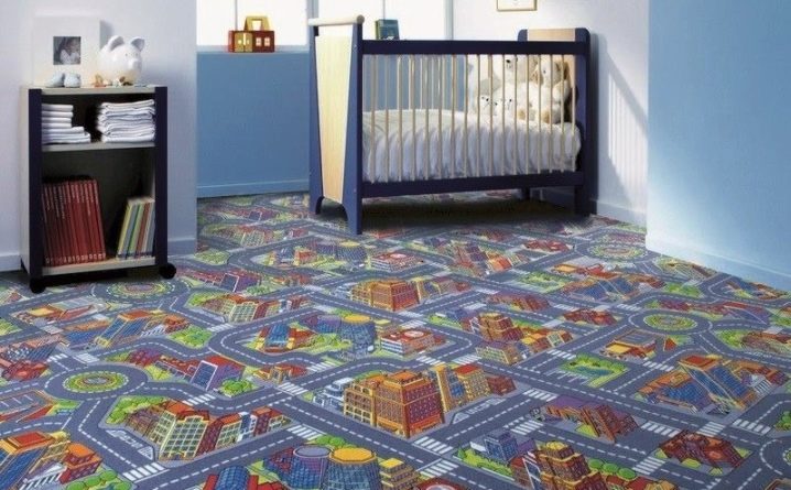 بالنسبة لغرف الأطفال ، يمكنك استخدام سجادة بنمط مواضيعي مشرق ، على سبيل المثال ، صور الشخصيات الكرتونية ، والألعاب ، والحكايات الخرافية..