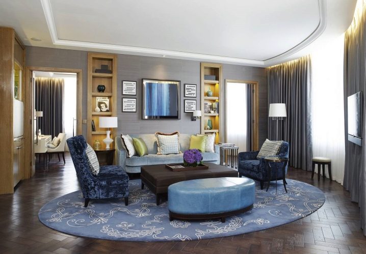 تم تخفيف السجادة اللطيفة ذات اللون الأزرق الرمادي المقيد بنجاح بنمط غير مزعج. يتم الجمع بين الظل والأثاث وتصميم الغرفة ، والدور الوظيفي للسجادة مرئي بوضوح – فهو يسلط الضوء على مكان للاسترخاء في غرفة المعيشة ، مما يخلق نوعًا من جزيرة الراحة.