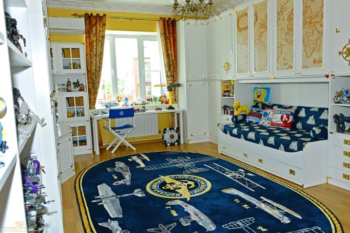 قد يكون لدى الطفل في الحضانة سجادة عليها رسومات. الطائرات هي موضوع مفضل للعديد من الأولاد ، وسوف يقدرون هذا الاختيار. اللون الأزرق الغامق عملي للغاية. بالإضافة إلى ذلك ، فإن الظل هادئ ، وهو أمر مهم ، لأنه في الحضانة ، لن يضطر الطفل إلى اللعب فحسب ، بل النوم أيضًا..
