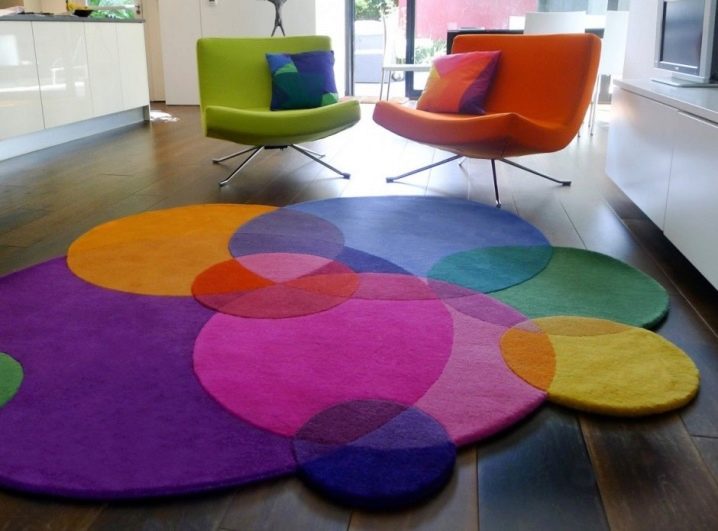 سجادة متعددة الألوان على شكل دوائر متصلة بقطعة قماش واحدة تبدو غير عادية وستحيي التصميم الداخلي الرتيب. يمكن أن يصبح الملحق لهجة أصلية إذا كانت الغرفة مزينة بألوان مقيدة. تبدو السجادة أنيقة وعصرية ، وتشبه أيضًا صورة مع مجموعة من الألوان وقد يحبها المبدعون.