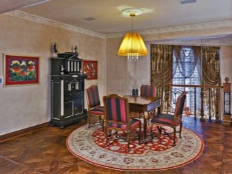 بالمناسبة ، غالبًا ما يتم استخدام السجاد البيضاوي والمستدير لتقسيم الغرفة. تعمل الدائرية أيضًا على إبراز اللمسات الداخلية. من الغريب أن كلاً من هذين الطرازين والنماذج الأخرى يشغلان مساحة أقل من المنتجات ذات الشكل المربع ، ولكن في نفس الوقت يوسعان الغرفة بصريًا..