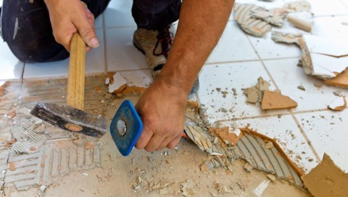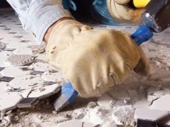 عادةً ما يتم تثبيت مثل هذا البلاط بإحكام على الخرسانة ، لذلك من المستحيل تمزيقه دون ضرر. يمكن ملء تلك المناطق التي تضررت أيضًا بخليط الخرسانة ، وبالتالي تسوية السطح تمامًا. التفكيك من هذا النوع صعب للغاية ومغبر ، لذلك عليك التحلي بالصبر وقناع يحمي الجهاز التنفسي.