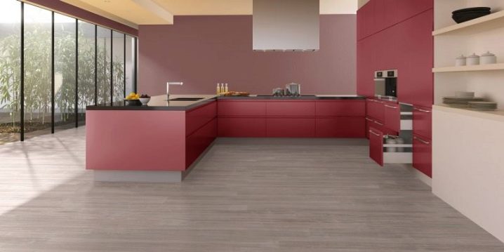 سيكون هذا المشمع إضافة رائعة لأي مطبخ. إنه لا يبرز ، لكنه يؤكد بشكل ملحوظ على تباين الأثاث الأحمر ، ويضعه في المقدمة. هذا الملمس هو الذي لا يسبب تهيجًا للعين ، بل يتدفق بسلاسة إلى الحائط ، والذي له نفس نظام الألوان..