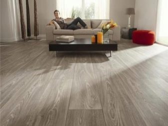 تبدو غرفة المعيشة مع الحد الأدنى من الأثاث والمشمع مع تقليد اللون الرمادي أنيقة ومكلفة. لا يمكن تمييز الأرضيات عن الأرضية التي تم تركيب صفيحة حقيقية عليها. نظام الألوان المختار جيدًا يجعل الأرضية الزخرفة الرئيسية للغرفة ، دون انتهاك مفهوم التصميم العام للغرفة.