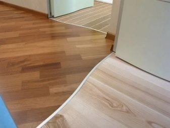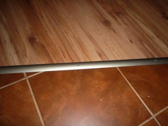 تُستخدم هذه الطريقة عند الانتقال من غرفة إلى أخرى (على سبيل المثال ، بين الممر والمطبخ) ، حيث تسمح لك مواد التثبيت أعلى المشمع بإغلاق قطعتين وإغلاق اللحامات. تربط العتبات المعدنية مادتين لهيكل مختلف. نطاق العتبات ليس واسعًا جدًا ، ولكن يمكنك العثور على خيار لون مناسب. هذا رصيف بسيط لا يتطلب معرفة ومهارات خاصة ، وهذا هو السبب في أنه الأكثر انتشارًا.