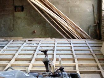 أرضية سفلية مصنوعة من الخشب مثبتة على قاعدة خرسانية. للقيام بذلك ، يتم وضع التأخر على السطح المُجهز..