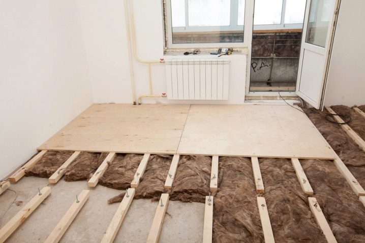 يتم وضع العزل بين السجلات بطريقة تجعلها متساوية معها, يجب ألا يكون هناك نتوءات. يتم وضع الخشب الرقائقي فوق هذا الهيكل. إذا كانت الميزانية محدودة ، فيمكن استبدال الخشب الرقائقي بلوح الأرضية..