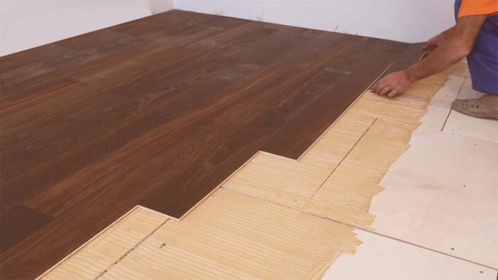 الطريقة الثانية لوضع ألواح الباركيه هي باستخدام غراء البولي يوريثين. مع ذلك ، يجب تسوية القاعدة الخرسانية ، ويجب تجفيف السطح وتجفيفه. يجب ألا يزيد محتوى الرطوبة في ذراع التسوية عن ثلاثة بالمائة. يتم وضع صفائح خاصة من الخشب الرقائقي على ذراع التسوية ، والتي يتم صقلها لاحقًا.