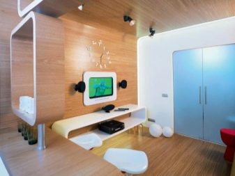 يعد تثبيت الباركيه على الحائط والسقف اتجاهًا آخر في الآونة الأخيرة. وهكذا ، تتحقق وحدة الداخل ، ويتم الحصول على نوع من “الصندوق”. هذه الغرفة مناسبة لوضع أنظمة السماعات – المسرح المنزلي وغرفة الموسيقى وجهاز العرض.