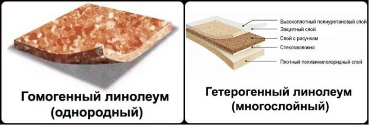 من خلال هيكلها ، ينقسم مشمع إلى غير متجانسة ومتجانسة. النوع الأول يتكون من عدة طبقات (2-7) أعلاها طبقة شفافة ومسؤولة عن مقاومة التآكل. بعد ذلك تأتي الطبقة الزخرفية ، والتي تحتوي مباشرة على نمط أو تصميم المنتج. المكون الأخير للطلاء غير المتجانس هو من طبقة واحدة إلى عدة طبقات ، مما يزيد من قوة الشد ويعطي عزلًا للمادة.