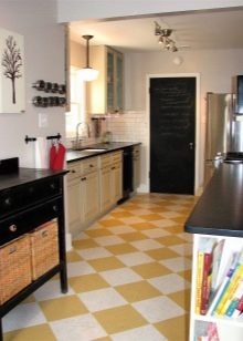 الخيار الأكثر حداثة للأرضية بالأبيض والأسود هو بلاطة على شكل رقعة شطرنج. غالبًا ما يتم اختيار هذا التصميم لمطبخ آرت ديكو..