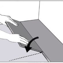 - ثم تحتاج إلى إزالة الغراء الزائد ، وتثبيت البلاط التالي مرة أخرى إلى السابق. يجب ألا تكون هناك فجوة بين عناصر الطلاء. إذا لزم الأمر ، يتم قطع بلاط المشمع بسكين تجميع أو مجفف شعر صناعي. افعل ذلك من الخارج لترى الرسم..