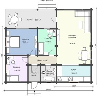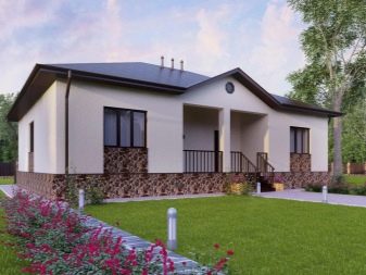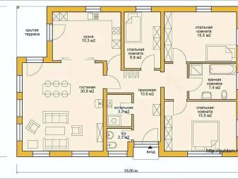 من أحدث المشاريع – منازل 10×15 م وما شابهها في الحجم. ميزتها عبارة عن شرفة أرضية ، يوجد من ركنها عمود يشبه عمودًا مربعًا. ديكور الشرفة يشبه المقهى الصيفي.