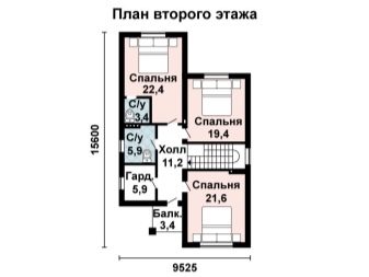 ثانيا: غرف النوم – 22.4 ، 21.6 و 19.4 ، الحمامات – 3.4 و 5.9 ، غرفة الملابس – 5.9 ، الشرفة – 3.4 ، القاعة – 11.2 مترًا مربعًا. الشرفة – فوق الشرفة.