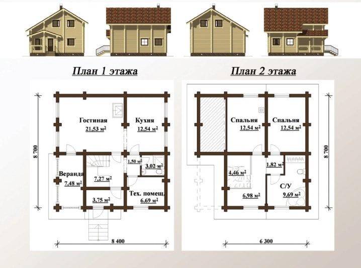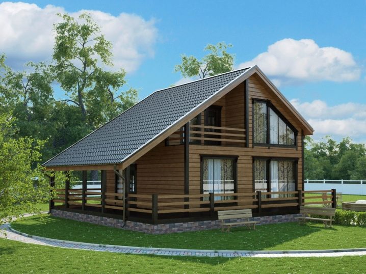 يفضل الكثير من الناس المساكن الخشبية المكونة من طابقين بمساحة 100-150 متر مربع.. يمكن أن يتم ذلك بسقف بني غامق. غالبًا ما يكون لهذه المنازل شكل غير قياسي ، فهي ، بالإضافة إلى غرفة المعيشة ، وغرفة المطبخ وتناول الطعام ، والعديد من غرف النوم ، يمكن أن تحتوي على حمامين ، وقاعة كبيرة ، ويمكن أن تحتوي أيضًا على شرفات منفصلة صغيرة ، وتراس ، و غرفة خلع الملابس أو دراسة.