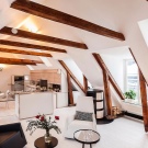 تُفهم منطقة المعيشة على أنها غرف مشتركة (غرف معيشة وصالات وغرف نوم لأفراد الأسرة وغرف ضيوف). من الأفضل إبقاء غرف نوم أفراد الأسرة بعيدًا عن أعين المتطفلين في أرضية العلية. وهي معزولة مع وجود مخارج لممر مشترك. هناك يمكنك أيضًا ترتيب غرفة استرخاء صغيرة أو ركن للقراءة. يوفر المشروع أحيانًا شرفة تقع في غرفة النوم أو في الصالة المشتركة..
