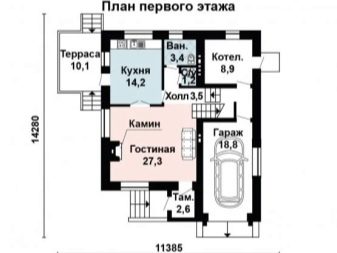 يمكنك أيضًا بناء منزل به مرآب من الخرسانة الخلوية. تبلغ مساحة غرفة المعيشة في الطابق الأول 27.4 مترًا مربعًا. م ، حتى أنه يحتوي على مدفأة. تبلغ مساحة مواقف السيارات 18.8 مترًا مربعًا. م حتى الحمام المتواضع منظم على هذا المستوى. غرفتا نوم و 4 غرف مخصصة ، ونوافذ بانورامية وإضاءة مزدوجة ستسعد الناس بالتأكيد.