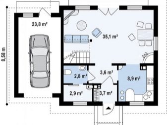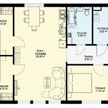 يتم الجمع بين المطبخ والمخزن ويشكلان حجرة مشتركة مع قسم مهجور جزئيًا ، وتصل مساحتهما إلى 16.7 متر مربع. غرفة المعيشة وتناول الطعام – 38.2 متر مربع. بالإضافة إلى المنزل ، يتم إرفاق مرآب – بمساحة 21.6 متر مربع. بجانبها ورشة – 7 متر مربع.