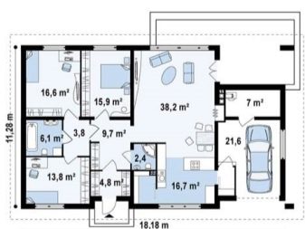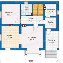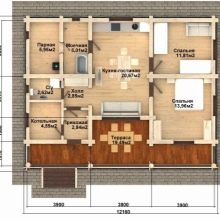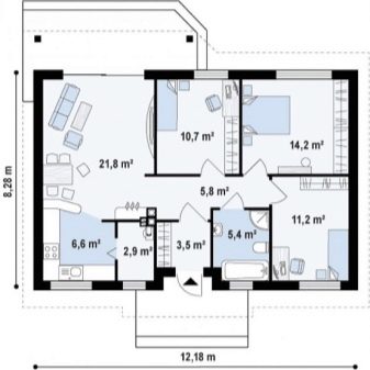 مثال على مشروع منزل 12 × 9 يساوي تقريبًا الأبعاد المعلنة في الأصل – يشغل المنزل الموجود في الموقع (على أساس) مساحة 8.28 * 12.18 م. مساحة البناء أقل بقليل من 108 م 2 ، وهذا ليس عيبًا كبيرًا في المشروع. هنا ، غرفة المعيشة والمطبخ مخصصة بشكل فعال: قسم تقسيم شبه شفاف يقسم هذه الغرفة إلى غرفة طعام – معيشة بمساحة 21.8 متر مربع.