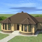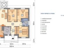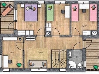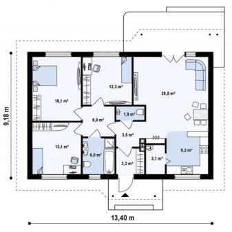 أحد البدائل للخطة المذكورة أعلاه هو ما يلي. يأخذ المستطيل في الكوخ الصيفي ، مع مراعاة المنطقة العمياء ، تحت أساس المنزل 9.18 * 13.4 م. تتعايش غرف النوم 13.1 و 16.1 و 14.2 متر مربع. ومع ذلك ، يوجد حمام مشترك وآخر “عالي التخصص” (فقط مع مغسلة ومرحاض) – 6 و 1.9 متر مربع. القاعة مقسمة إلى قسمين – 3.5 و 5 م 2 ، والدهليز 3.3 م 2.