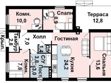 المطبخ ، باستثناء أثاث المطبخ والأدوات الصحية ، الذي تم تخصيص مساحة على شكل حرف L له ، يظل 6.8 متر مربع. يوجد مخزن بمساحة 2.9 متر مربع بجوار المطبخ. تشكل الأجزاء الثلاثة مستطيلًا واحدًا متساويًا. تم تخصيص الدهليز 3.5 متر مربع ، القاعة – 5.8. غرف النوم – 10.7 و 14.2 و 11.2 مترًا مربعًا. تبلغ مساحة الحمام المشترك 5.4 مترًا مربعًا ، مما قد لا يسمح بتركيب غسالة هناك ، على سبيل المثال. في غرف النوم وفي الردهة يوجد مكان لخزانة الملابس. شرفة خارجية مجاورة لغرفة الطعام والمعيشة.