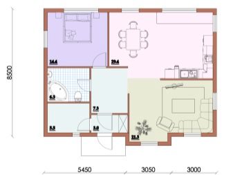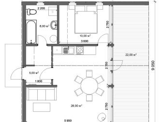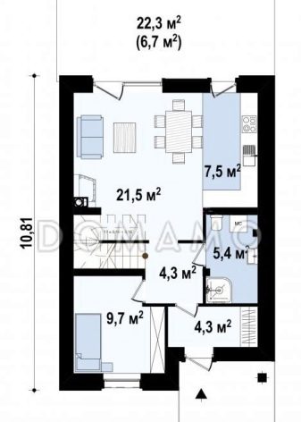 خيار بديل هو تجهيز شرفة بطول 22 مترًا. عند دخول المنزل من هناك ، يجد الناس أنفسهم في الردهة ، وهي أيضًا منطقة المعيشة. يمكن الوصول إلى المطبخ من هناك ومن خلال مدخل منفصل. حجم القاعة 4.3 “مربعات”. يوجد أيضًا حمام بمساحة تزيد عن 5.4 متر مربع.