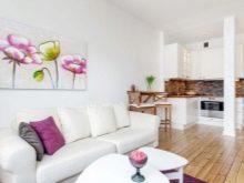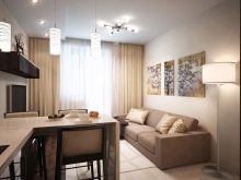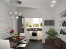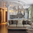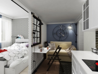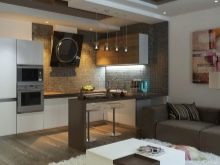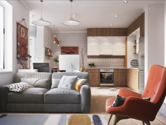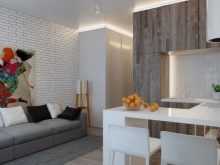 يتيح لك الجمع بين المطبخ وغرفة المعيشة زيادة مساحة الغرفة المراد تزيينها. يمكنك تقسيم غرفة المعيشة في المطبخ إلى منطقتين باستخدام طاولة بار وأريكة وحتى حوض مائي. يمكنك استخدام ألوان مختلفة لتقسيم المناطق. الشيء الرئيسي هو أن الغرفة تحتوي على عناصر توحد أسلوب الغرفة..