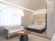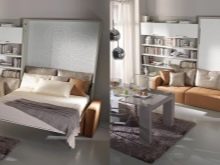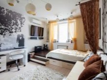 لتغيير التصميم في غرفة نوم صغيرة الحجم ، تحتاج إلى وضع خطة مسبقًا لدمج المناطق الرئيسية الثلاث فيها. يجب أن تتكون الغرفة من منطقة لتناول الطعام والنوم والعمل ، لذلك من المهم اختيار أثاث مضغوط لهم. سيكون مفيدًا بشكل خاص في هذه الحالة هو السرير القابل للطي ، والذي يمكن إزالته أسفل قاعدة التمثال أو تثبيته رأسياً. إذا سمح ارتفاع الأسقف ، فيمكن رفع الرصيف فوق مستوى الأرضية بمقدار 1.5 متر.