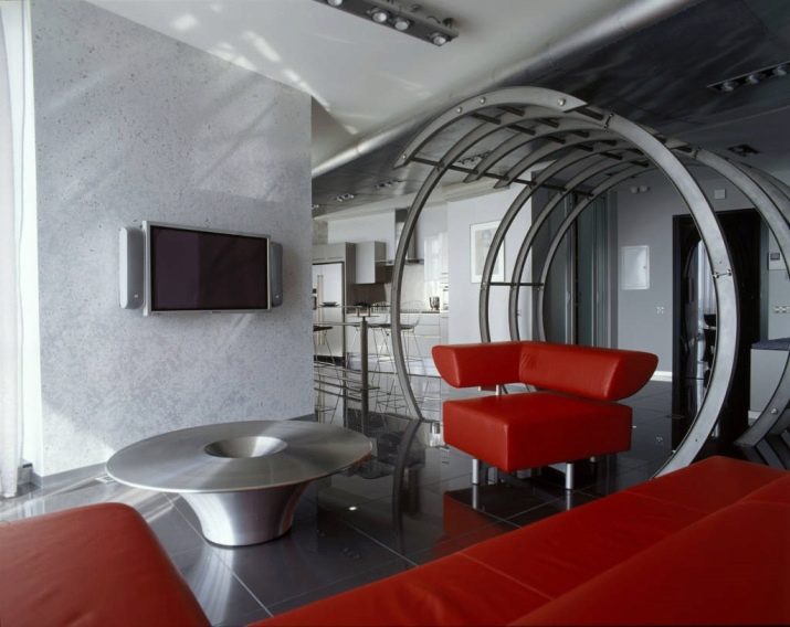 الأسلوب هو نوع من البساطة ، ولكن على عكس ذلك ، فإنه يرحب بوفرة من التفاصيل فائقة الحداثة. يمكنك تأثيث غرفة بأشياء معدنية وزجاجية دون خوف من زيادة التحميل على المساحة. تتيح لك تقنية Hi-tech استخدام الألوان الزاهية في الزخرفة وتثبيت أحدث التقنيات للعرض.