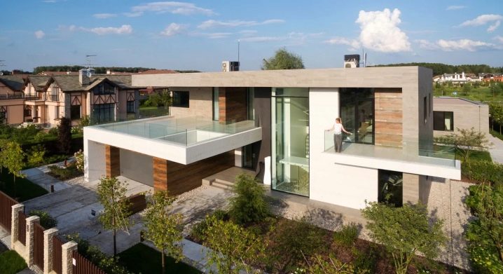 هذا هو منزل سقف مسطح مبتكر عالي التقنية حقيقي. هذا الخيار مناسب لمحبي الحداثة والحلول غير القياسية. سيستغرق بناء هذه المباني الكثير من الوقت ، ولكن بعد الانتهاء من البناء ، سيحصل أصحابها على نتيجة ممتازة..