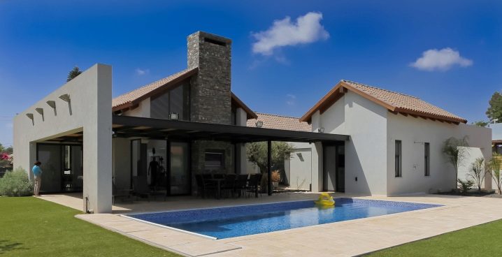 تُظهر الصورة الرابعة كوخًا حديثًا آخر به عناصر كلاسيكية وبيت ضيافة منفصل. من السمات المميزة للمشروع حمام السباحة والشرفة حيث يمكنك الاستمتاع بأمسيات ممتعة مع العائلة أو الأصدقاء في فصل الصيف.