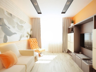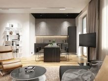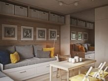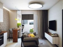 - تؤدي غرفة المعيشة نفسها (وهي أيضًا الوحيدة في حالتنا) عدة وظائف: غرفة نوم ومنطقة لعب (إذا كان الأطفال يعيشون في الشقة) ومنطقة لتناول الطعام (جنبًا إلى جنب مع مطبخ) ومنطقة عمل مع طاولة كمبيوتر محمول مريحة وكرسي مريح ورف للكتب.