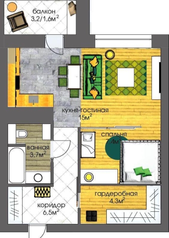 مثال على تصميم شقة من غرفة واحدة بمساحة 40 مترًا مربعًا. م انظر الفيديو التالي.