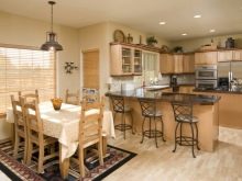 - إذا كانت مساحة المطبخ تسمح لك بوضعها ، بالإضافة إلى قطع الأثاث القياسية ، وطاولة طعام أيضًا ، فمن المنطقي التفكير في فصل جزء من مساحة المطبخ عن غرفة الطعام. يمكن أن يكون هذا هو الجدول الأكثر شيوعًا الذي يمكن أن يستوعب أكبر عدد ممكن من الأشخاص الذين يتم تجميعهم معًا ، بالإضافة إلى اثنين من الضيوف. في أغلب الأحيان ، يتم استبدال الجدار الفاصل بين المطبخ والغرفة بقسم زخرفي (شبه شفاف أو أصم) ، والذي يمكن أن يزيد بشكل كبير من المساحة الصالحة للاستخدام في المطبخ ويخلق منطقة مريحة لتناول الطعام ، والتي يمكن أن تكون أيضًا بمثابة غرفة معيشة.
