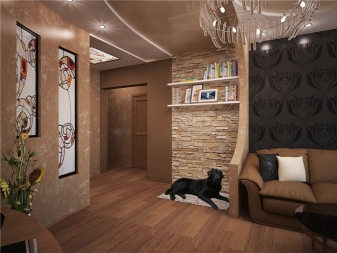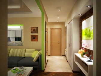 - لا تنس الرواق. حتى لو كانت “رقعة” صغيرة أمام الباب ، فلا يجب إهمال حجمها المتواضع. يمكن أن يتناسب المدخل بشكل عضوي مع مساحة غرفة المعيشة ، وبالتالي توسيع المنطقة لوضع الخزائن أو أرفف الحائط. من الممكن أيضًا الجمع بين الردهة والمطبخ: في هذه الحالة ، لدينا غرفة معيشة صغيرة ، متصلة منطقيًا ببقية مساحة الشقة.