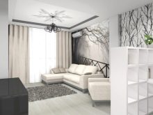 مزيج ممتاز من الألوان الفاتحة السائدة مع الستائر والأريكة الداكنة. تجدر الإشارة إلى أنه في هذا المثال ، يتم دمج لوجيا مع الغرفة وتعمل كمنطقة عمل.