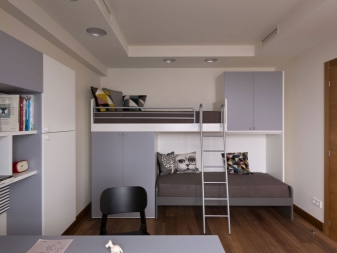 نظرًا لأننا ندرس خيارًا لشقة صغيرة نسبيًا ، بل وحتى صغيرة الحجم ، يجب أن يكون للأثاث الموجود فيها صفتان: الوظيفة والأبعاد المدمجة. لا ينبغي إهمال الطبقة الثانية لاستيعاب أماكن النوم., خاصة إذا كان ارتفاع السقف 2.8 متر على الأقل. بالإضافة إلى أماكن النوم ، يوصى أيضًا باستخدام الطبقة الثانية لتخزين الملابس الموسمية والأشياء الضرورية الأخرى..