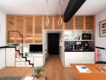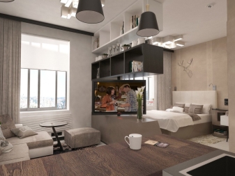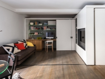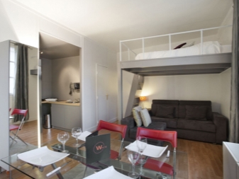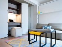 تفترض شقة الاستوديو وجود عناصر تحويل الأثاث: أريكة تطوي وتتكشف بحركة واحدة أو حركتين ، جنبًا إلى جنب مع رف أو مكان عمل ؛ سرير لشخصين في الطبقة الثانية ، وفي الأول يوجد مكان عمل متعدد الوظائف مع درج لتخزين أغطية السرير وخزانة ملابس مدمجة.