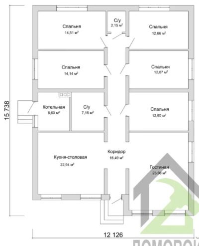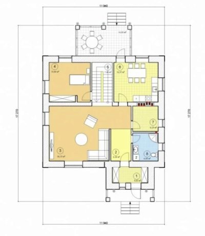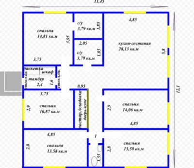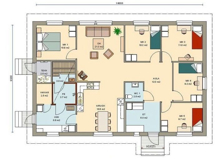 كوخ من طابق واحد بأبعاد 11.45 × 12.1 مترًا ويتكون من خمس غرف نوم وغرفة معيشة مشتركة كبيرة مع مطبخ وغرفة طعام. المنزل له مدخل واحد مع باب مصنوع من الزجاج المتين. يؤدي الباب الزجاجي الثاني في دهليز صغير إلى قاعة تقع في وسط المبنى. تربط القاعة بين غرفة المعيشة والمطبخ وغرفتي نوم وحمام مشترك وممر يمكنك من خلاله الوصول إلى 3 غرف نوم أخرى وغرفة تخزين وغرفة مرجل. المنزل مضغوط مع موقع مريح. أكبر غرفة نوم بها حمام خاص بها.
