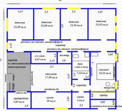 تم تصميم مشروع منزل حديث 13×14 م لعائلة كبيرة ، يحتوي على 4 غرف أطفال وغرفة نوم واحدة للبالغين. مدخل الكوخ من خلال شرفة أرضية زجاجية دافئة مع ثلاثة أبواب: