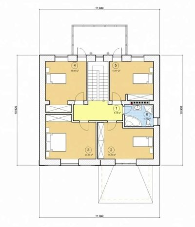 تم تقليل مساحة الطابق العلوي بسبب وجود الضوء الثاني. تؤدي درجات السلم إلى رواق يمكن الوصول منه إلى أربع غرف نوم. توجد غرفة تخزين فوق غرفة الغلاية ، وفي زاوية الطابق الثاني يوجد لوجيا واسع.