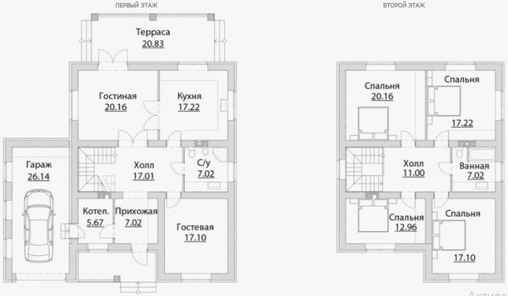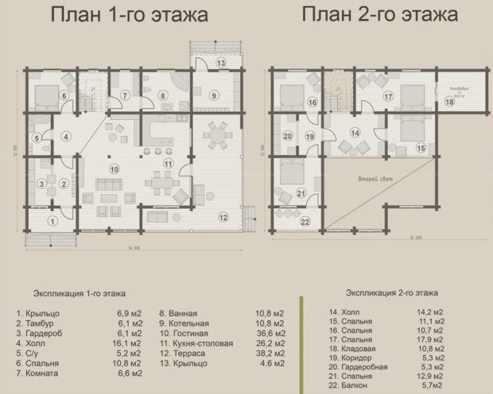 يمكن للمنزل المكون من طابقين أن يوفر مساحة إجمالية تبلغ 300 متر مربع أو أكثر ، بينما يحتل مساحة قطعة أرض أصغر من كوخ من طابق واحد بأبعاد متواضعة. في مثل هذه المباني ، تقع جميع غرف النوم تقريبًا في الطابق الثاني ، يوجد أدناه مساحة لغرفة نوم واحدة فقط للضيوف. يشغل الطابق الأول غرفة معيشة كبيرة – مطبخ وجميع الغرف الفنية.