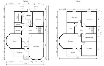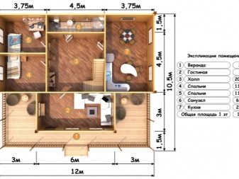 الكوخ 10×12 م له مدخلين من الشرفة والشرفة الواقعة على الجانبين المتقابلين من المبنى. يحتوي كل مدخل على دهليز صغير يسمح لك بالتدفئة في المنزل.. ترتبط كل من الدهليز بقاعة واسعة تشغل الجزء المركزي من الطابق الأول. النوافذ الكبيرة على اليمين واليسار هي المطبخ وغرفة المعيشة. يؤدي الباب في إحدى الردهات إلى غرفة المرجل. تحتوي الصالة على مدخل للصالة وغرفة نوم ومطبخ وحمام ودورة مياه وكذلك درج يؤدي إلى الطابق الثاني.