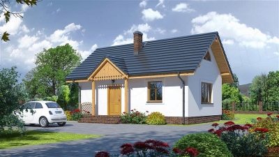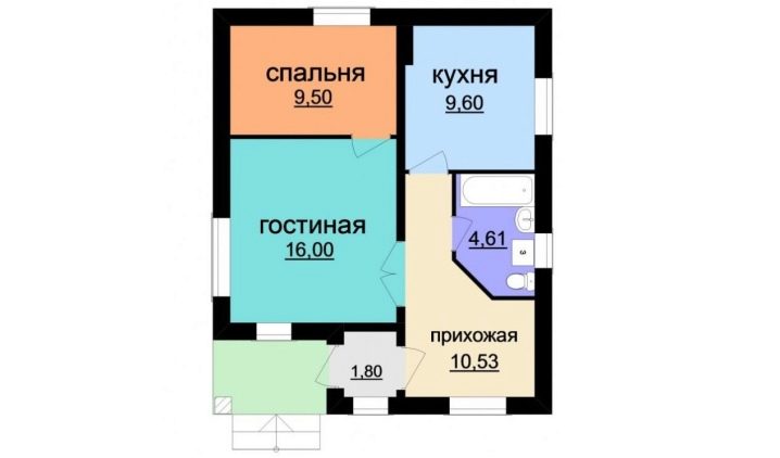 يمكن بناء منزل مماثل بسهولة من الأخشاب أو على أساس جدران من الطوب.. لكن هناك مشاريع أخرى تستحق الدراسة. في هذا الإصدار ، تبلغ مساحة غرفة المعيشة 14 مترًا مربعًا تقريبًا. حجم المطبخ ، الذي يزيد قليلاً عن 9.4 متر مربع ، كافٍ للطهي المريح. تم تقليص الردهة بشكل كبير ، ولكن تم تجهيز الممر والحمام.
