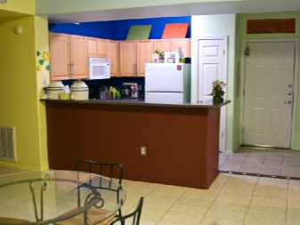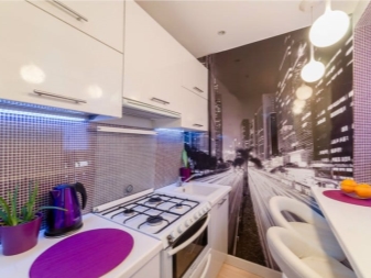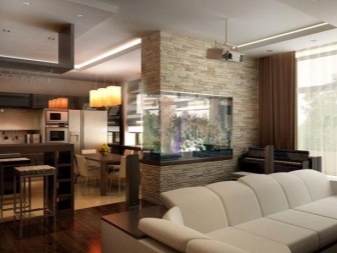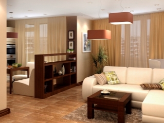 إذا تم الجمع بين غرفة المعيشة والمطبخ ، فمن المنطقي تقسيمها باستخدام تقسيم المناطق. يمكن القيام بذلك باستخدام أقسام زخرفية متوفرة بتشكيلة ضخمة ، وكذلك عن طريق تقسيم ورق الحائط وأغطية الأرضيات حسب اللون..