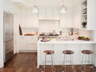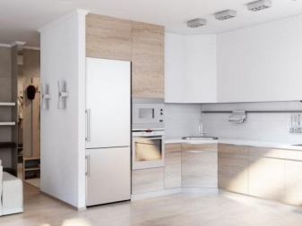 بغض النظر عن الأسلوب المختار ، يوصي الخبراء بتزيين المطبخ بألوان فاتحة ، خاصة إذا لم يكن هناك مساحة كبيرة فيه. يمكن للألوان البيضاء والحليبية والقشدية تكبير المساحة بصريًا ، مما يجعلها أكثر راحة. من الأفضل اختيار الأرضيات الخشبية أو الباركيه أو البلاط كأرضية للغرف المدمجة..
